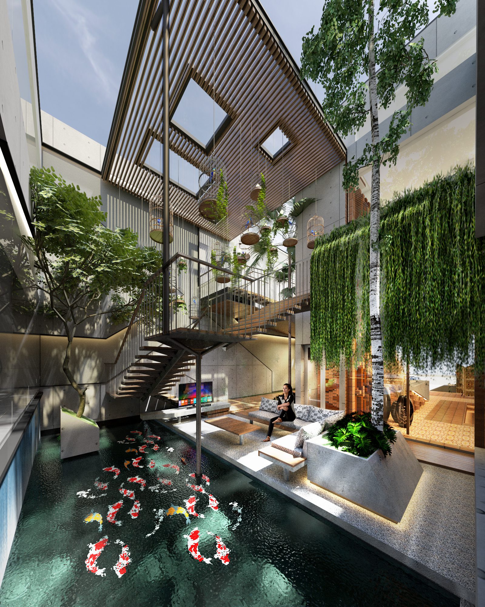 As for the zoning, the basement was used as commercial retail for authentic Balinese batik and the 2nd floor would be used as private home area for the owner. The unique part of the layout of this house is the main entrance towards the private home. The entrance of the private home was separated by a small alley with plants along it until you reach the inner court of open-air garden as a relax area or to welcome guest that was strolling at the commercial area on the 1st floor. The inner court would enrich you with the natural surroundings like bird chirpings with specific design of cages along the staircase and also the sound of calming water from the small pond below the stairs.